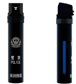 1、产品外观:催泪器的颜色为黑色,其上印刷字样和图案为白色。产品外观应洁净无变形,表面印刷字样、图案应清晰完整,准确牢固。产品正面(喷嘴方向为正向,正向罐体为侧面)印刷“警徽”图案和“警察”、“POLICE”、“催泪喷射器”字样;警徽应符合GA244-2000《人民警察警徽技术标准》。两侧面有透视窗,可观察药剂状态。