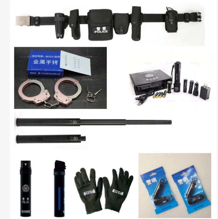 然后多功能腰带+手铐+手电+基础伸缩甩棍+竖喷催泪+防割手套+警哨