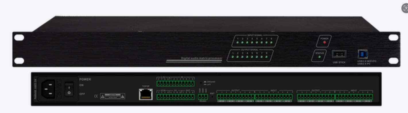 | 14进8出,频率响应20Hz-20KHz;动态范围>100dB;失真率<0.01% at1kHz(0dBu); ● 28/56-bit DSP芯片处理,48kHz采样率,24bit AD/DA转换。 ● 话筒通道具有独立的+48V幻象电源,话筒和线性输入增益可切换,话筒的输入的灵敏度可调。 ● 输入通道处理部分包含低切、参量均衡、噪声门、增益、静音、相位、连动调节、音量编组调节等处理功能。 ● 输出通道处理部分包含分频、参量均衡、增益、静音、压缩/限幅器、相位、延时、连动调节、音量编组调节等处 理单元。 ● 所有通道的PEQ增益、带宽、频率连续可调,类型可选择: 参量均衡、低架滤波、高架滤波、低切滤波、高切滤波、 1阶移相、2阶移相。 ● 输入AUX通道10x8全混音矩阵设计,输出独立8x10全混音矩阵可自由分配到任意通道。其中AUX编组通道带独立的 自动混音、自适应陷波反馈抑制、专业的ECHO及REV双引擎多重效果器、图示均衡等处理功能。 ● 输入低切、输出分频滤波器的类型可选择:巴特沃斯、林奎瑞利、贝塞尔,斜率连续可选。 ● 输入通道噪声门的门限值、启动时间、恢复时间连续可调。输出通道的压缩器阀值,比率,启动时间,恢复时间 连续可调。 ● 立体声音乐输入通道带有独立的效果处理模块:低音增强、3D效果、激励器、立体声空间扩展等。可切换立体声 双模蓝牙V5.0输入、OTG(USB 2.0 全速控制器)声卡输入、U盘播放音源。 ● 输出带独立的录音通道,录音的增益可以单独控制,可选择任意输入通道的音源来通过OTG或者是U盘进行录音。 ● 任意通道之间参数设置可以自由复制,以及任意通道可以进行连动调节。 ● 内置测试信号发生器,输出方式可选粉红噪声,白噪声及20Hz-20kHz正弦波信号,信号幅度可调。 ● 前面板带有2.8寸彩色LCD屏,显示所有的数值和预设信息、以及系统菜单等。面板编码器可独立控制输入通道的 音量和静音。 SD卡/U盘播放配有独立的按键操作,USB数据控制端口用来连接PC软件。后面板有232&485控制端口, 以及网络连接远程控制端口,一键式连机使得用户的操作更简易、快捷。 ● 支持232/网口控制代码协议,包括所有音量的控制、静音控制、预设场景调用、参数查询及回码、任意输入及输 出通道的4编组控制等等。 ● 设备可存储20个用户预设,整机参数和单独预设都可以在电脑存储和调用。还具有密码保护功能,使设备更安全。 |